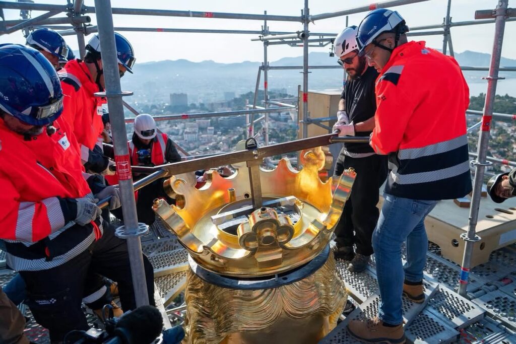 Depuis février, la Bonne Mère était en pleine cure de jouvence. Sa couronne, rongée par le temps, a dû être descendue pour être restaurée, une première. Trop haute pour une grue, c’est un hélicoptère d’Airbus qui a assuré l’hélitreuillage à 211 mètres d’altitude. En bas, cinq doreuses ont redonné à l’or son éclat, pendant que le chaudronnier Thomas Pagès refaisait l’armature en inox. Coût total : 2,8 millions d’euros, dont 2,2 pour la redorure.