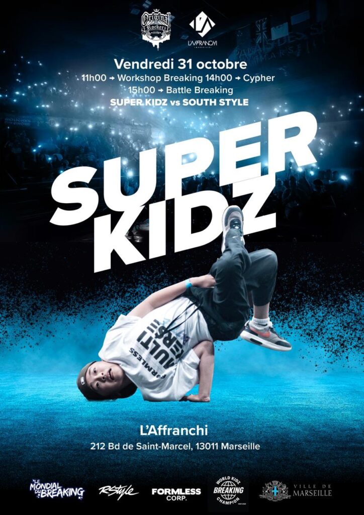 Le premier battle SUPER KIDZ aura lieu le 31 octobre à L’Affranchi. Et Marseille, ville de sueur et de soleil, va vibrer comme jamais. Sur scène, une team d’élite internationale. Des noms qui claquent comme des beats : Bboy Hollyrain et son équipe, champions du monde et étoiles montantes du circuit, défieront une nouvelle génération du Sud (Southstyle), tout comme le génie Maloy, venu tout droit de Sibérie. Ensemble, ils repousseront les limites de la créativité, de la stratégie et de la performance collective.