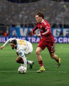 À force de jouer avec le feu, Marseille s’est brûlé. Juste avant la pause, une faute grossière de Leonardo Balerdi offrait un coup franc idéal à Dominik Szoboszlai. Le Hongrois ne se faisait pas prier : ballon malin, trajectoire parfaite, le portier battu. (0‑1, 45ᵉ). Liverpool menait sans briller, mais Liverpool menait.